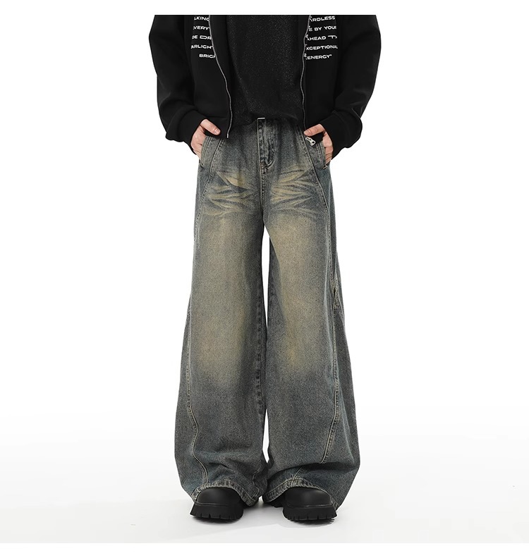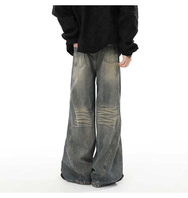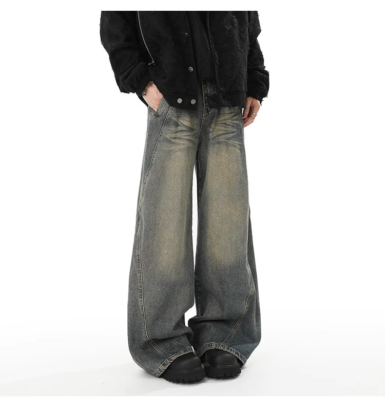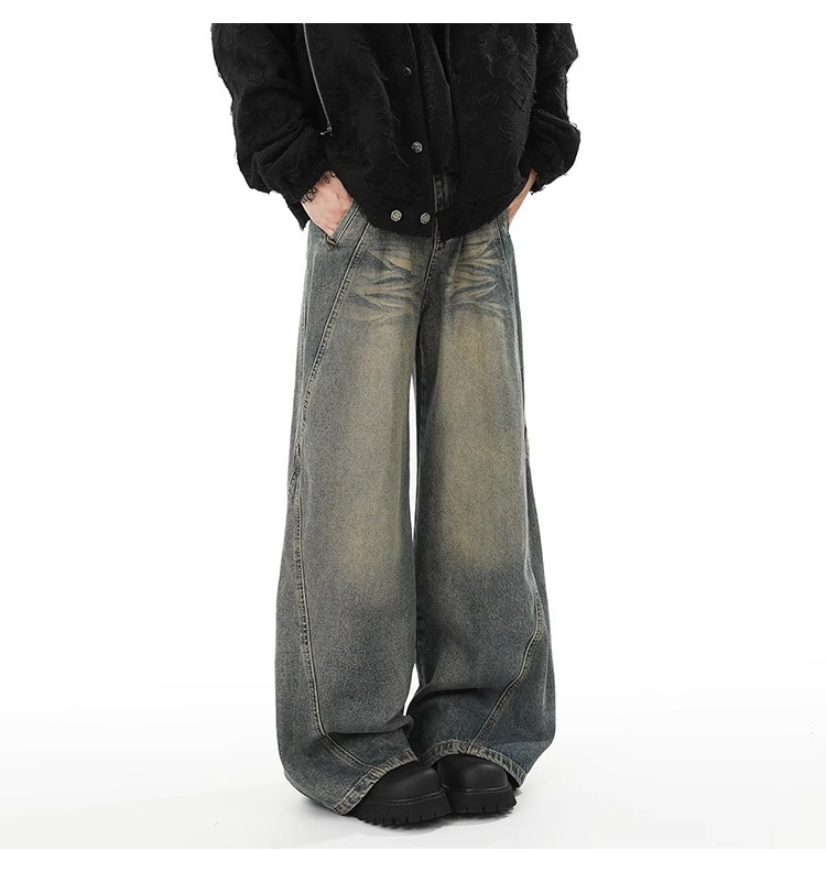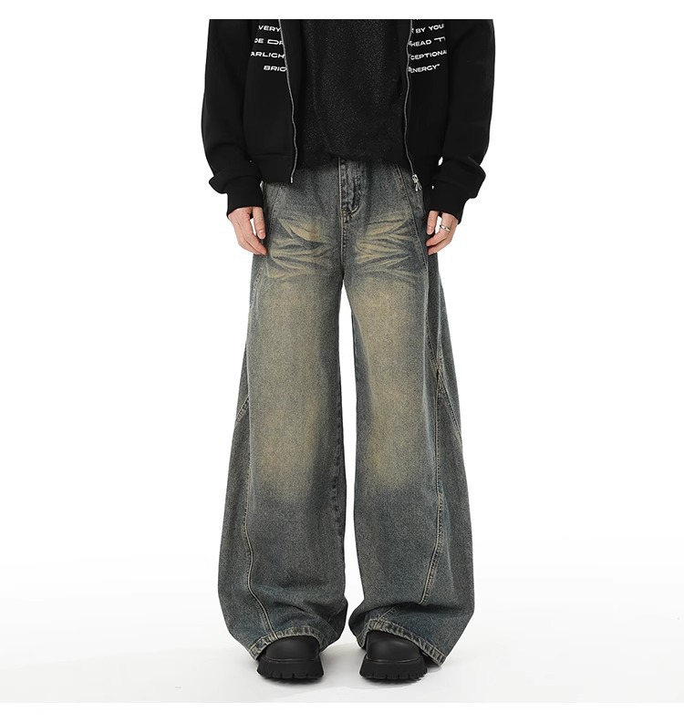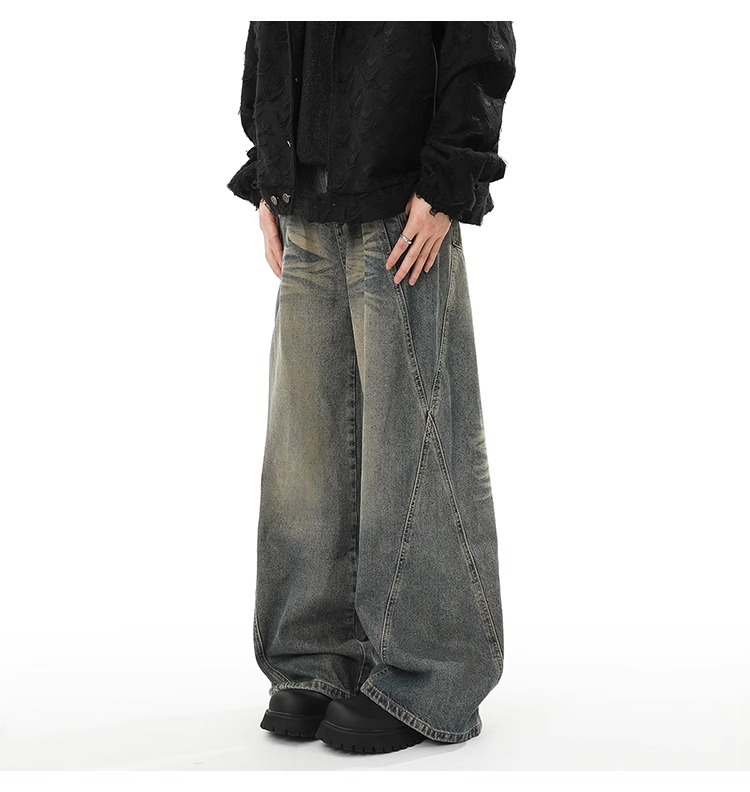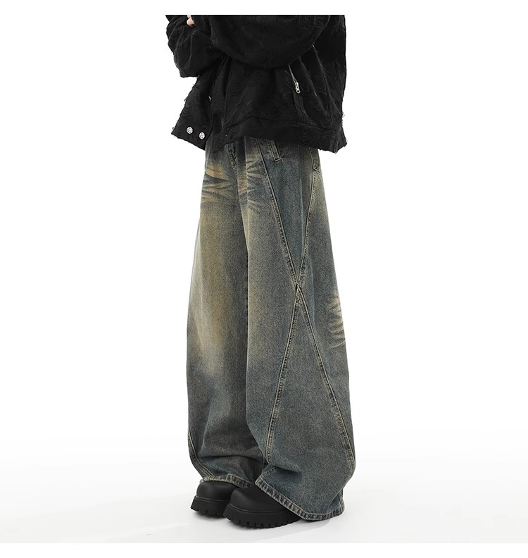 Washed Distressed Stitching Jeans Men’s Straight Loose Wide-leg Pants