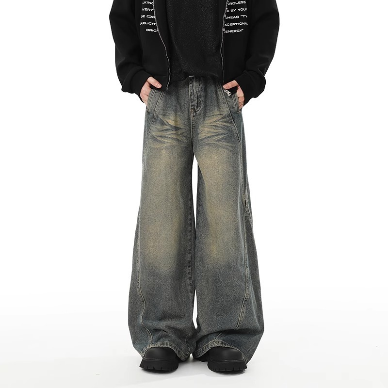 Washed Distressed Stitching Jeans Men’s Straight Loose Wide-leg Pants